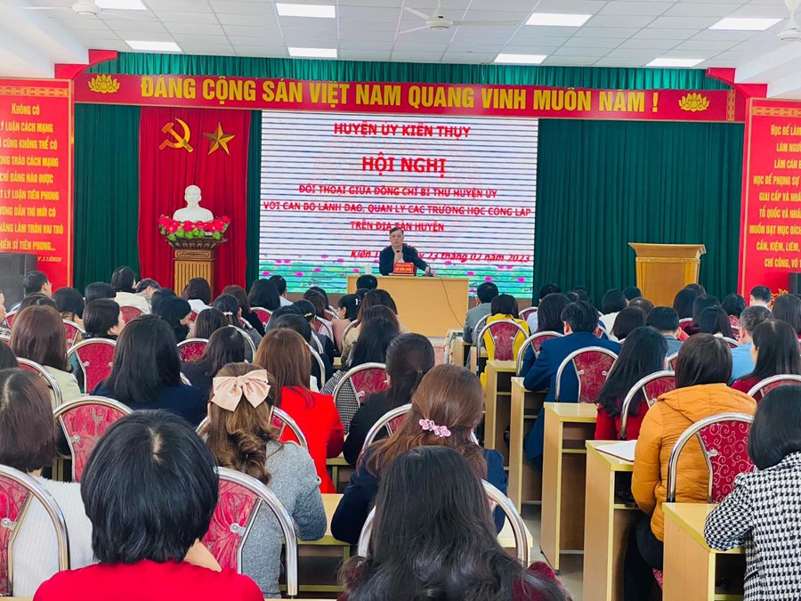2023; Kế hoạch số 117-KH/HU, ngày 14/02/2023 của Ban Thường vụ Huyện ủy, chiều ngày 23/02/2023 Ban Thường vụ Huyện ủy tổ chức Hội nghị đối thoại giữa đồng chí Bí thư Huyện ủy với cán bộ lãnh đạo, quản lý các trường học công lập trên địa bàn huyện. Dự hội nghị có đại diện các ban xây dựng Đảng của Thành ủy cùng hơn 150 đại biểu đại diện Lãnh đạo các Ban xây dựng Đảng, Văn phòng Huyện ủy, Trung tâm Chính trị huyện; MTTQ và các tổ chức chính trị - xã hội huyện; lãnh đạo một số phòng chuyên môn thuộc UBND huyện; Bí thư chi bộ, hiệu trưởng, phó hiệu trưởng các trường THCS, TH, TH &THCS, MN công lập trên địa bàn huyện; Bí thư Đảng bộ các trường THPT: Kiến Thuỵ, Nguyễn Đức Cảnh, Thuỵ Hương; Bí thư Chi bộ Trung tâm GDNN-GDTX huyện.