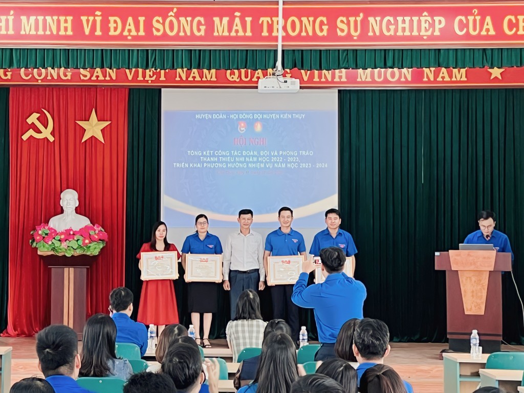 | Huyện đoàn Kiến Thuỵ trao Bằng khen của Trung ương Đoàn cho đại diện Ban Chấp hành Đoàn trường THPT Kiến Thuỵ (thứ 2 bên phải) |