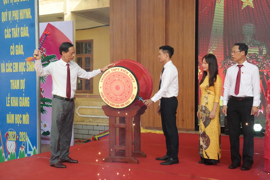 Phó Bí thư Thường trực Thành ủy Đỗ Mạnh Hiến đánh trống khai giảng năm học mới 2023-2024 tại trường THPT Kiến Thụy